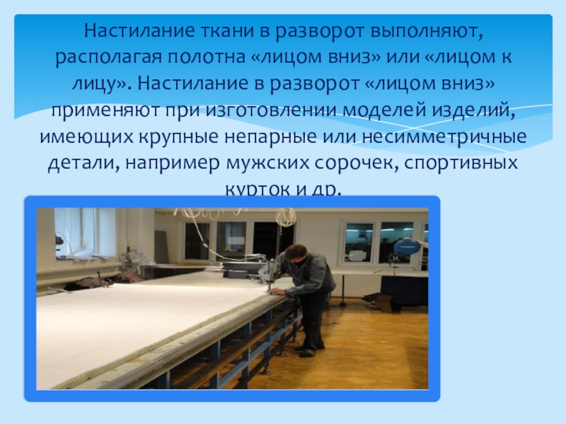 Слайд 19Настилание ткани в разворот выполняют, располагая полотна «лицом вниз» или «лицом