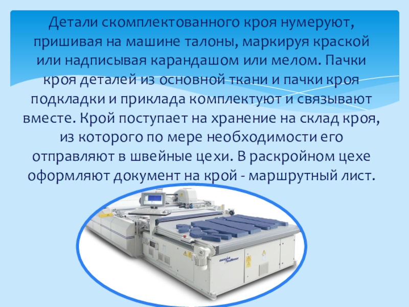 Слайд 32Детали скомплектованного кроя нумеруют, пришивая на машине талоны, маркируя краской или