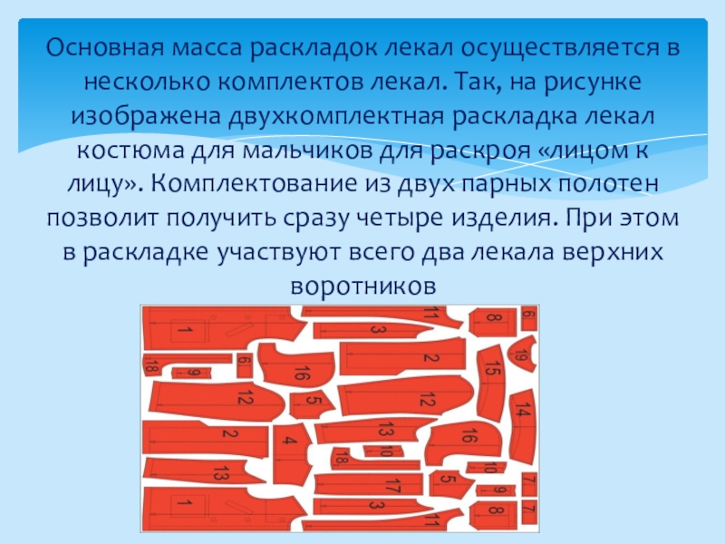 Основная масса раскладок лекал осуществляется в несколько комплектов лекал. Так, на