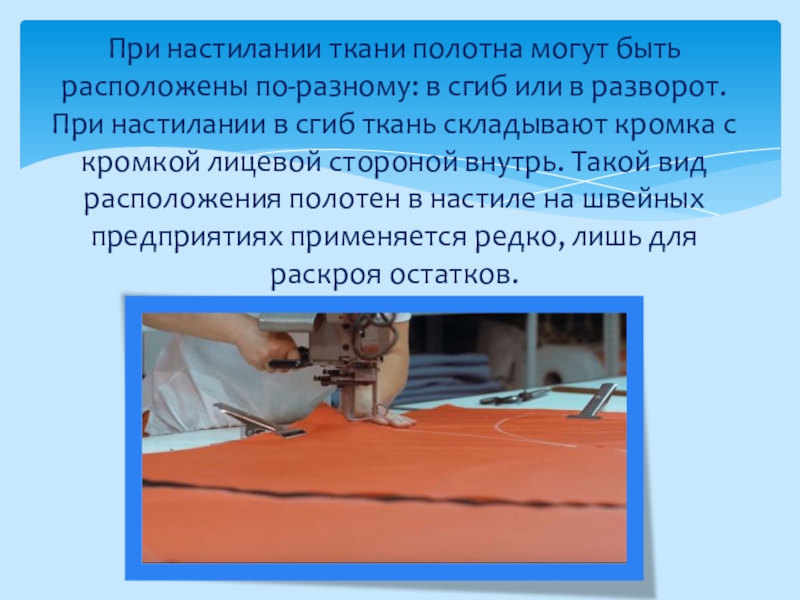 Слайд 18При настилании ткани полотна могут быть расположены по-разному: в сгиб или