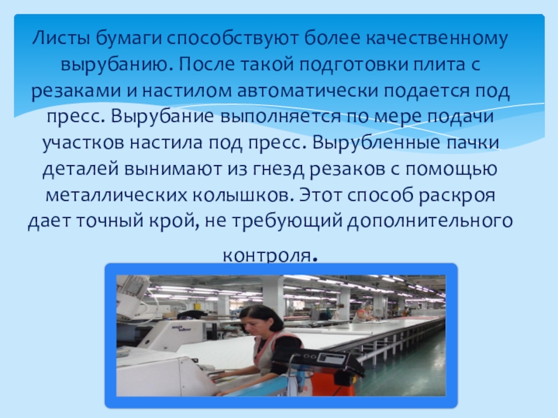 Слайд 28Листы бумаги способствуют более качественному вырубанию. После такой подготовки плита с