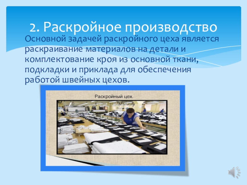 Слайд 10Основной задачей раскройного цеха является раскраивание материалов на детали и комплектование