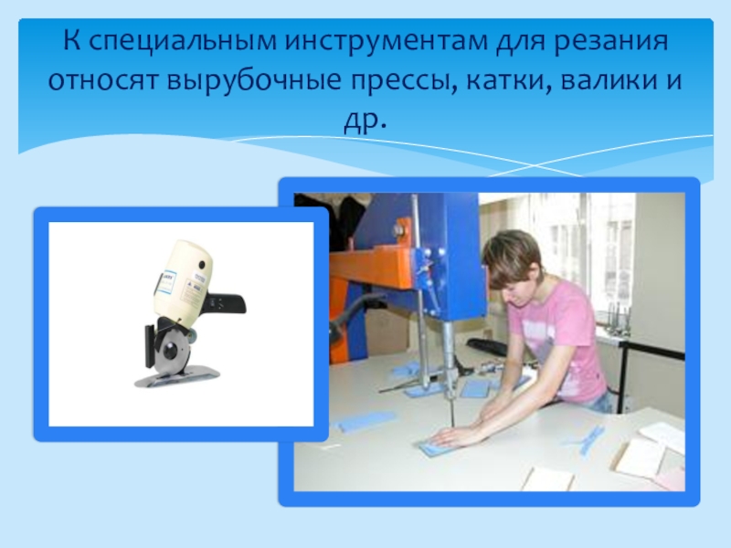 Слайд 22К специальным инструментам для резания относят вырубочные прессы, катки, валики и