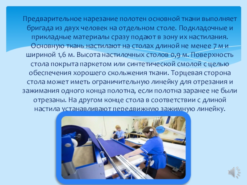 Слайд 17Предварительное нарезание полотен основной ткани выполняет бригада из двух человек на