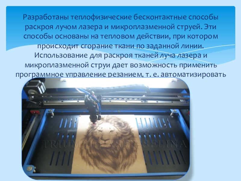 Слайд 29Разработаны теплофизические бесконтактные способы раскроя лучом лазера и микроплазменной струей. Эти