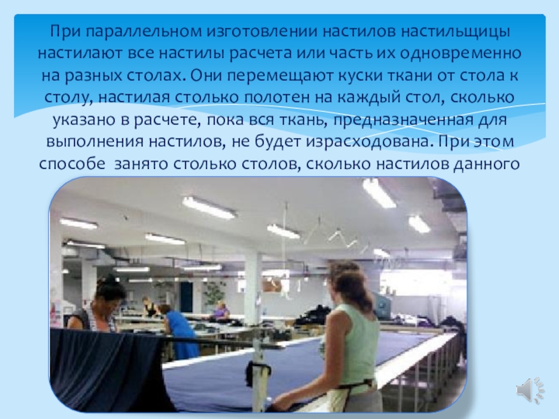 Слайд 15При параллельном изготовлении настилов настильщицы настилают все настилы расчета или часть