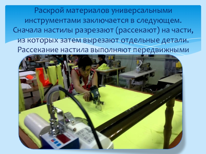 Слайд 23Раскрой материалов универсальными инструментами заключается в следующем. Сначала настилы разрезают (рассекают)