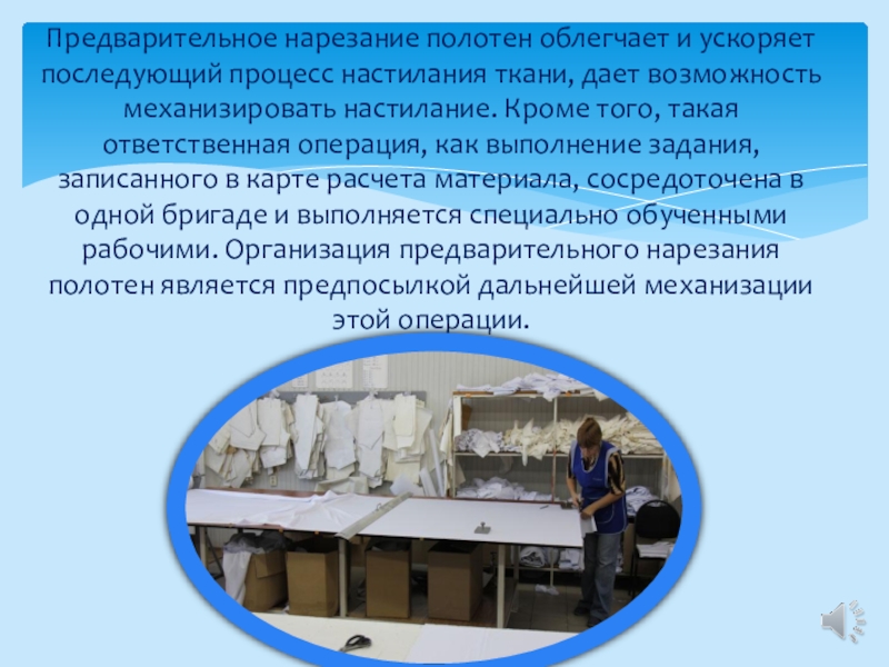 Слайд 16Предварительное нарезание полотен облегчает и ускоряет последующий процесс настилания ткани, дает
