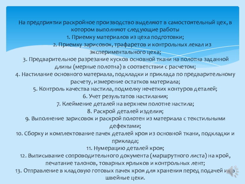 Слайд 12На предприятии раскройное производство выделяют в самостоятельный цех, в котором выполняют