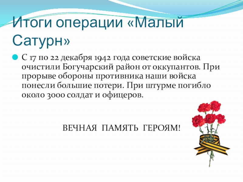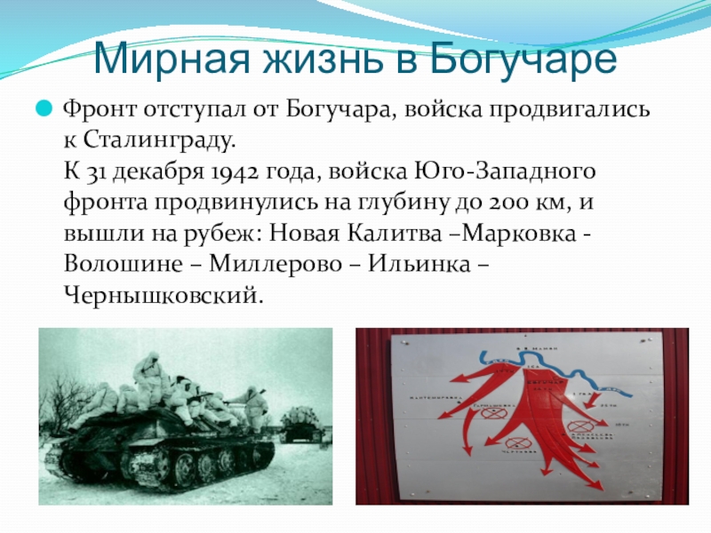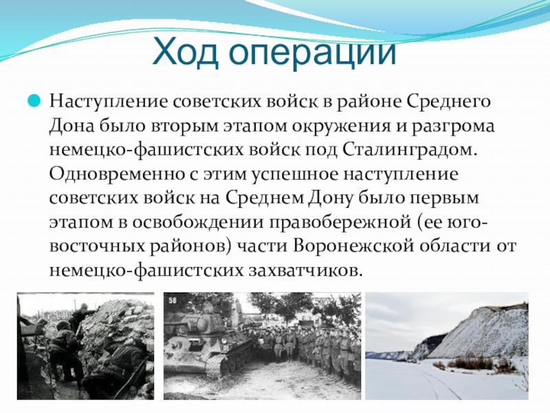 окружения и разгрома немецко-фашистских войск под Сталинградом. Одновременно с этим успешное наступление советских войск на Среднем Дону было первым этапом в освобождении правобережной (ее юго-восточных районов) части Воронежской области от немецко-фашистских захватчиков.