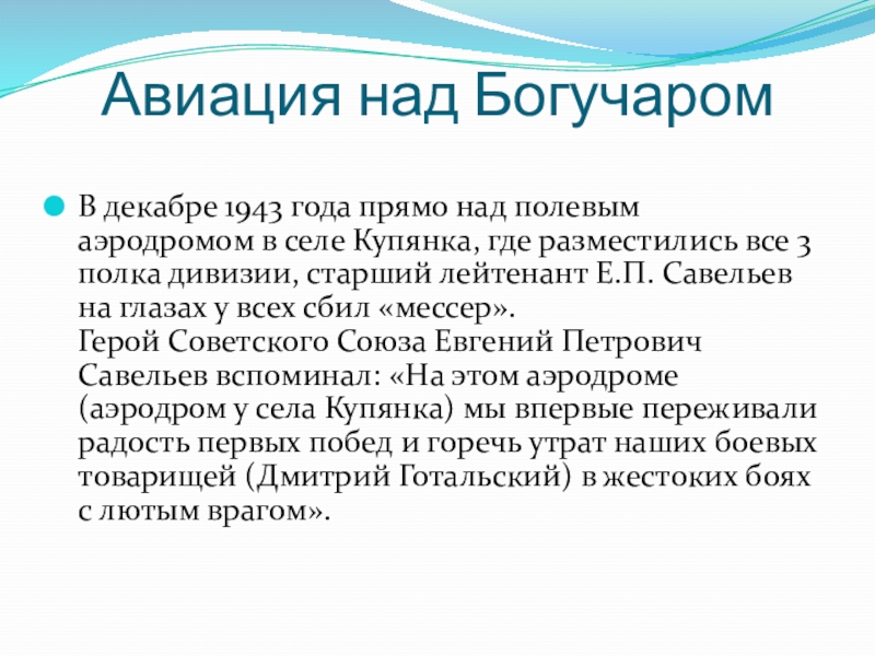 селе Купянка, где разместились все 3 полка дивизии, старший лейтенант Е.П. Савельев на глазах у всех сбил «мессер».