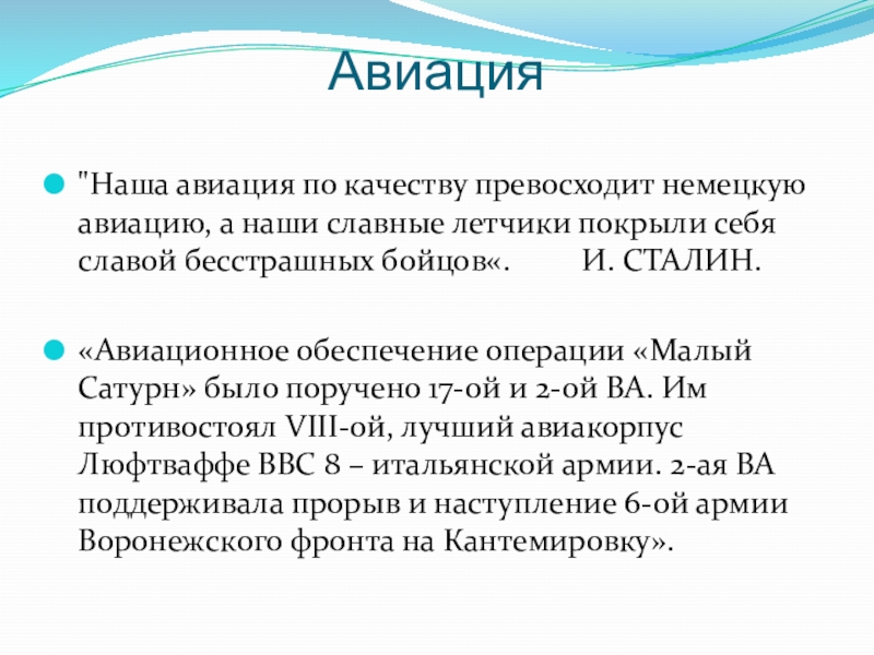 «Авиационное обеспечение операции «Малый Сатурн» было поручено 17-ой и 2-ой ВА. Им противостоял VIII-ой, лучший авиакорпус Люфтваффе ВВС 8 – итальянской армии. 2-ая ВА поддерживала прорыв и наступление 6-ой армии Воронежского фронта на Кантемировку».