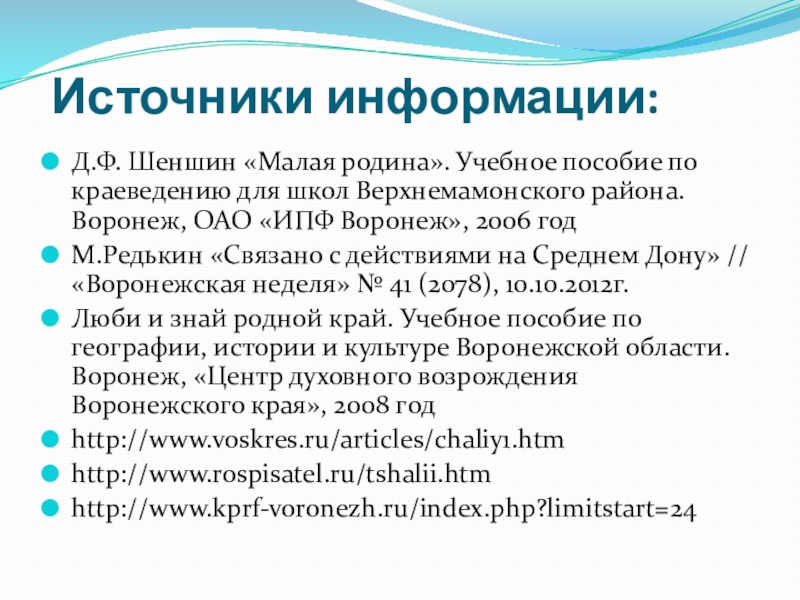 Люби и знай родной край. Учебное пособие по географии, истории и культуре Воронежской области. Воронеж, «Центр духовного возрождения Воронежского края», 2008 год
