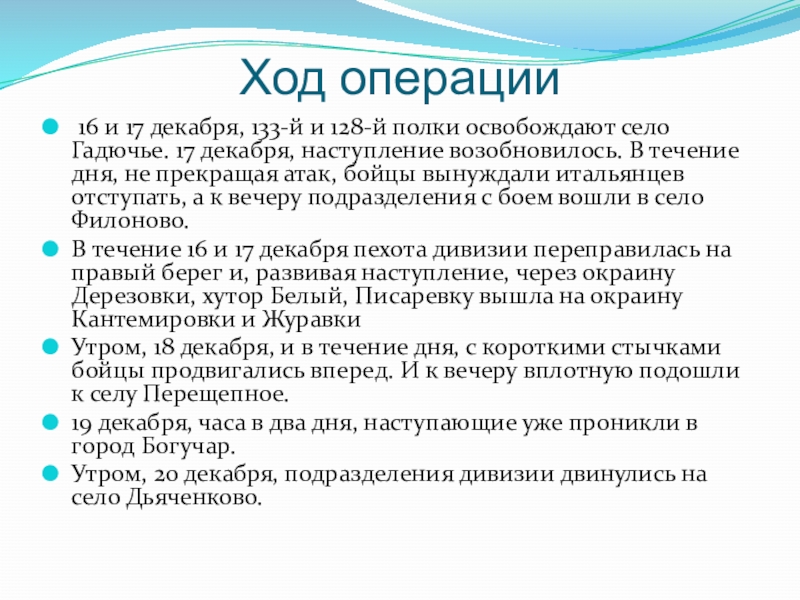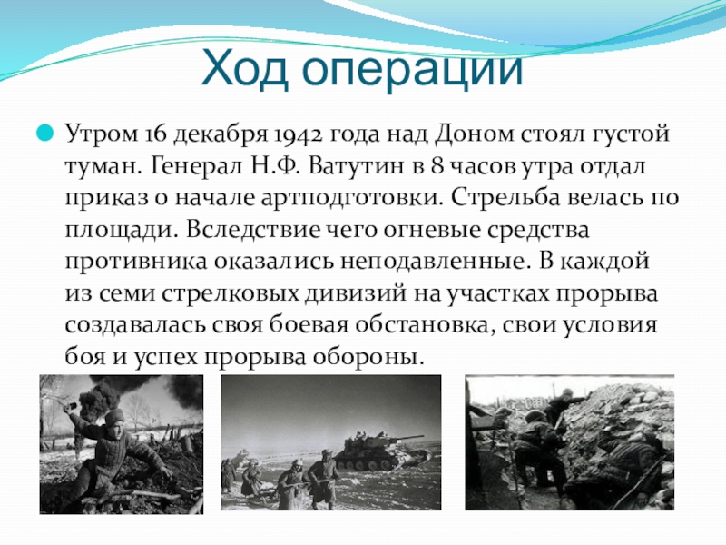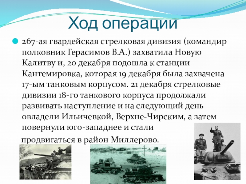 нашими войсками было занято более 200 населенных пунктов, в том числе города Новая Калитва, Кантемировка, Богучар … . В ходе наступления наши войска разгромили девять немецких дивизий и одну пехотную бригаду противника. Прорыв осуществлен силами Юго-Западного фронта, которым командовал Ватутин Н.В. и Воронежского фронта, которым командовал генерал-лейтенант Голиков Ф.И.».