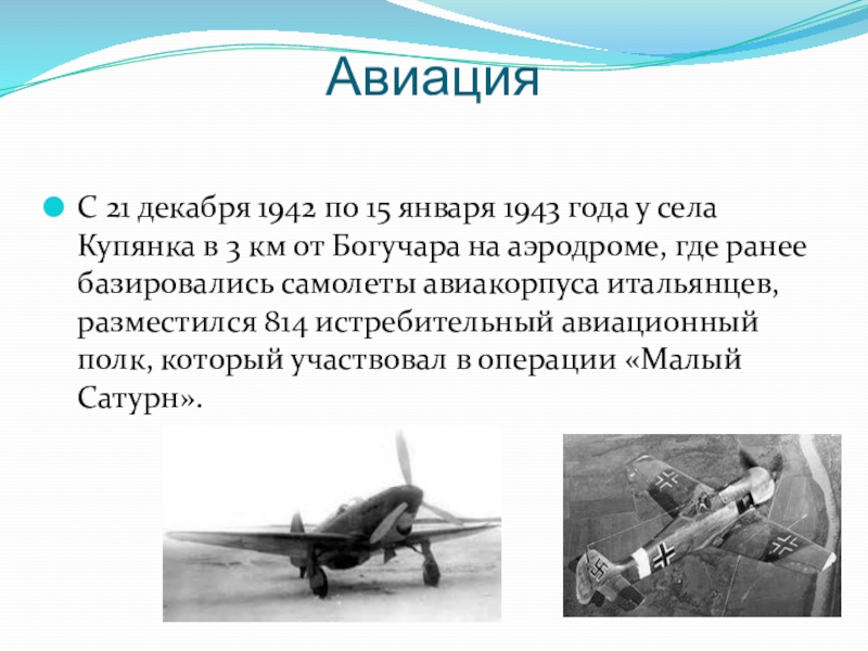 села Купянка в 3 км от Богучара на аэродроме, где ранее базировались самолеты авиакорпуса итальянцев, разместился 814 истребительный авиационный полк, который участвовал в операции «Малый Сатурн».