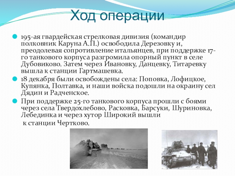 и, преодолевая сопротивление итальянцев, при поддержке 17-го танкового корпуса разгромила опорный пункт в селе Дубовиково. Затем через Ивановку, Данцевку, Титаревку вышла к станции Гартмашевка.