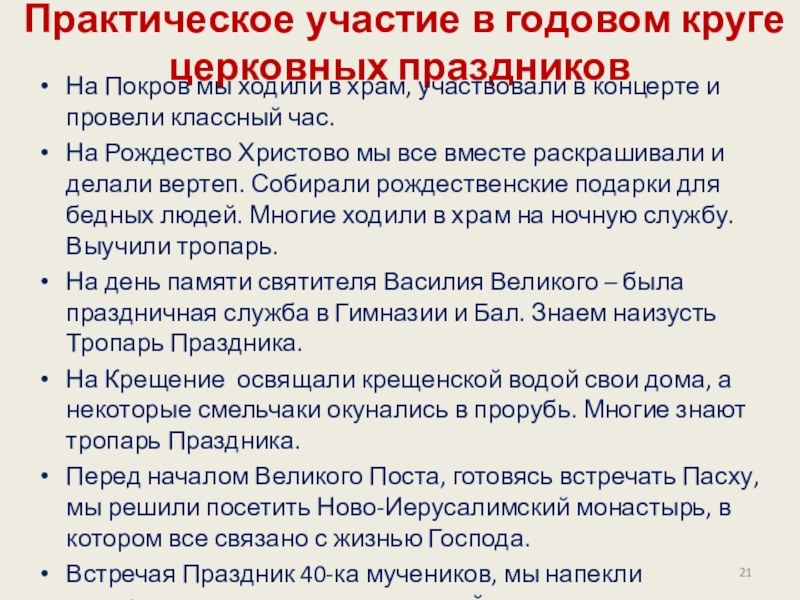 Слайд 21Практическое участие в годовом круге церковных праздников