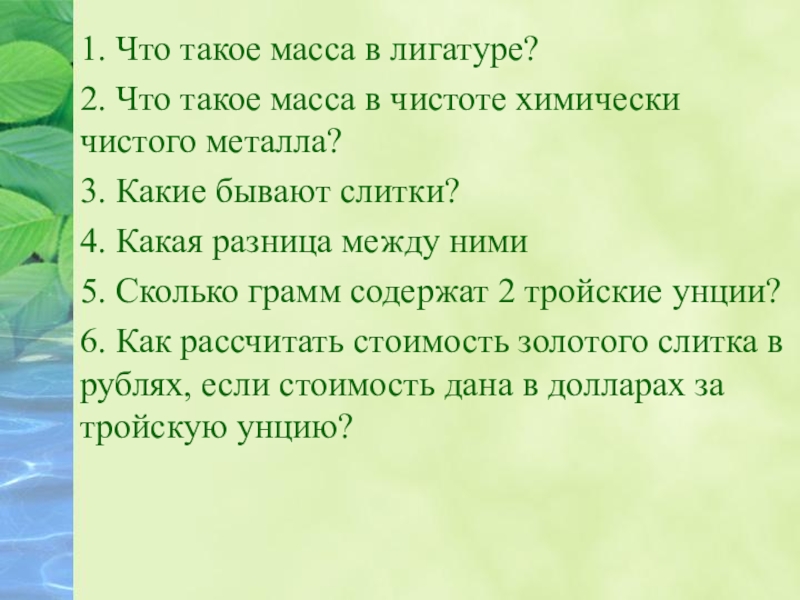 6. Как рассчитать стоимость золотого слитка в рублях, если стоимость дана в долларах за тройскую унцию?