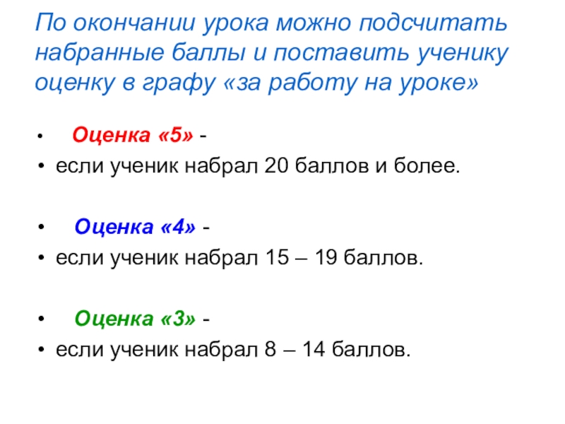 «3» - если ученик набрал 3 балла ( за контрольную работу – 5-6 баллов).