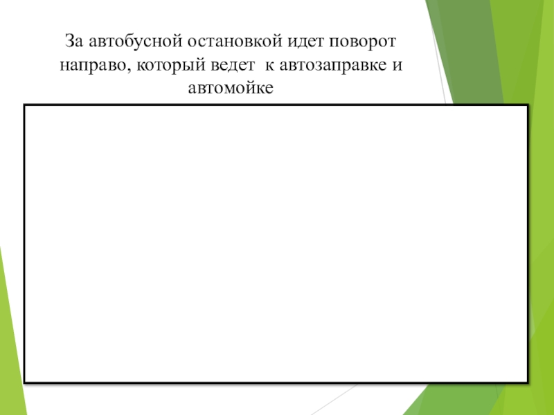 Слайд 20За автобусной остановкой идет поворот направо, который ведет к автозаправке и