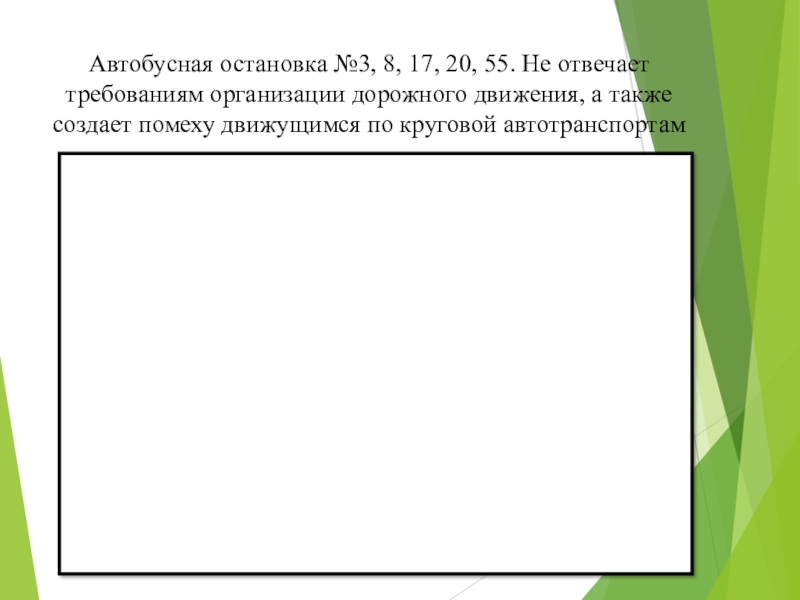 Слайд 15Автобусная остановка №3, 8, 17, 20, 55. Не отвечает требованиям организации