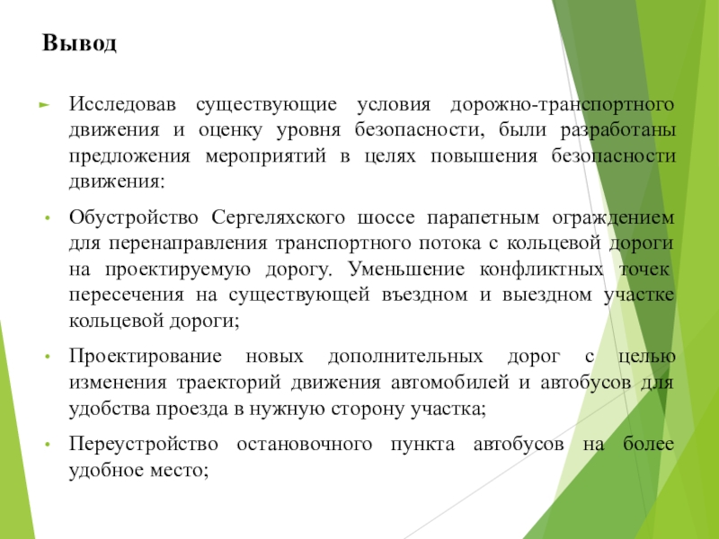 ВыводИсследовав существующие условия дорожно-транспортного движения и оценку уровня безопасности, были разработаны предложения мероприятий в целях повышения безопасности