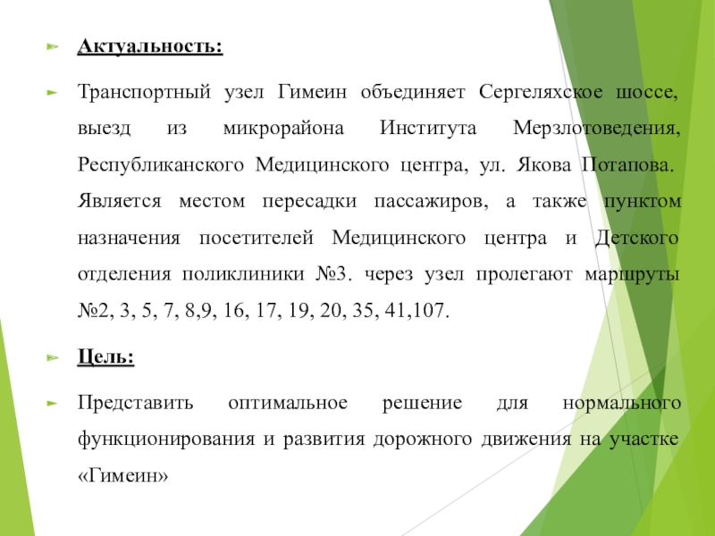 Актуальность: Транспортный узел Гимеин объединяет Сергеляхское шоссе, выезд из микрорайона Института Мерзлотоведения, Республиканского Медицинского центра, ул. Якова