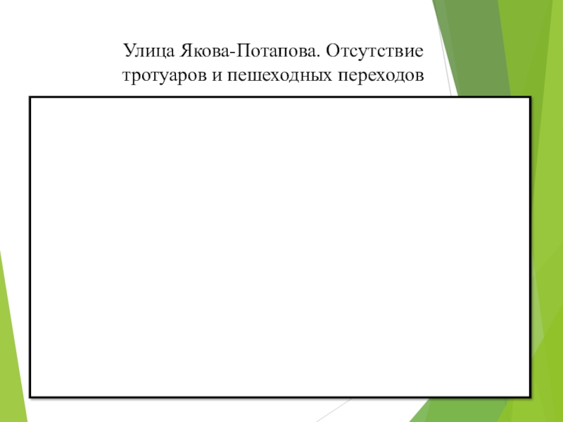 Слайд 12Улица Якова-Потапова. Отсутствие тротуаров и пешеходных переходов