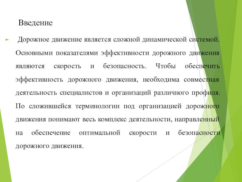 Введение	Дорожное движение является сложной динамической системой. Основными показателями эффективности дорожного движения являются скорость и безопасность. Чтобы обеспечить