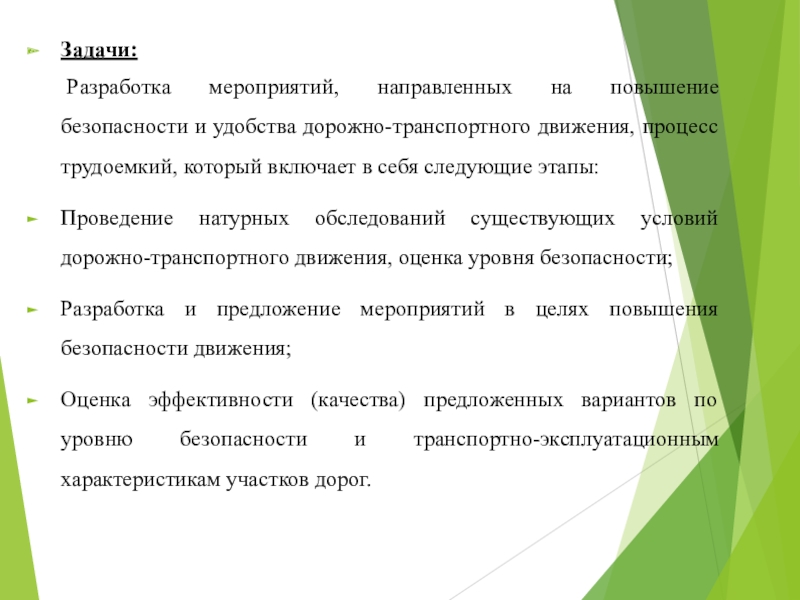 Задачи:	Разработка мероприятий, направленных на повышение безопасности и удобства дорожно-транспортного движения, процесс трудоемкий, который включает в себя следующие