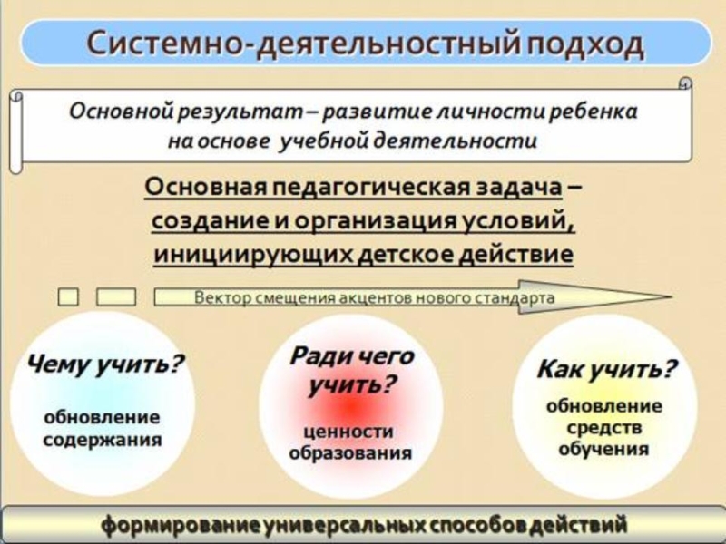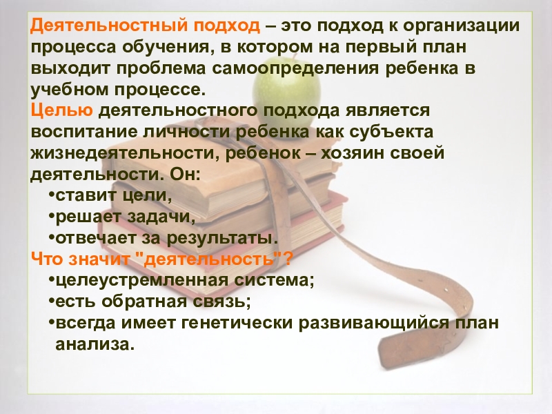 Целью деятельностного подхода является воспитание личности ребенка как субъекта жизнедеятельности, ребенок – хозяин своей деятельности. Он: