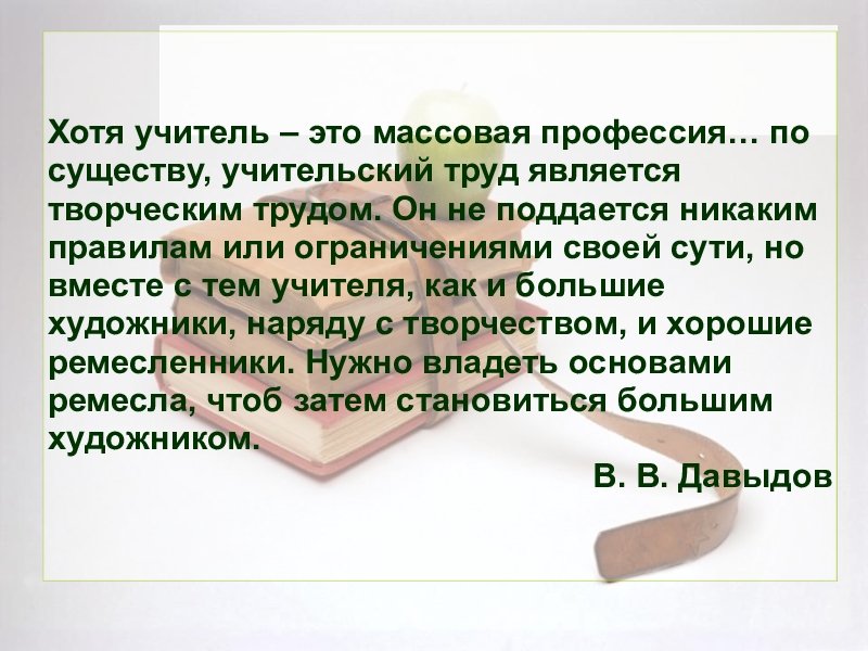 творческим трудом. Он не поддается никаким правилам или ограничениями своей сути, но вместе с тем учителя, как и большие художники, наряду с творчеством, и хорошие ремесленники. Нужно владеть основами ремесла, чтоб затем становиться большим художником.