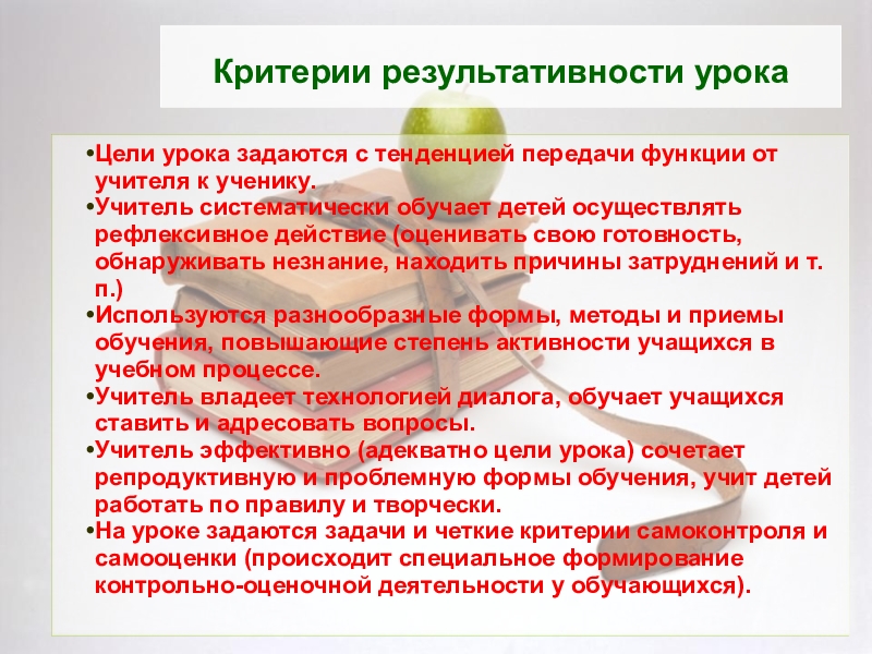 На уроке задаются задачи и четкие критерии самоконтроля и самооценки (происходит специальное формирование контрольно-оценочной деятельности у обучающихся).