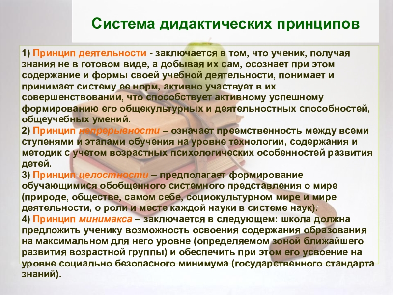 4) Принцип минимакса – заключается в следующем: школа должна предложить ученику возможность освоения содержания образования на максимальном для него уровне (определяемом зоной ближайшего развития возрастной группы) и обеспечить при этом его усвоение на уровне социально безопасного минимума (государственного стандарта знаний).