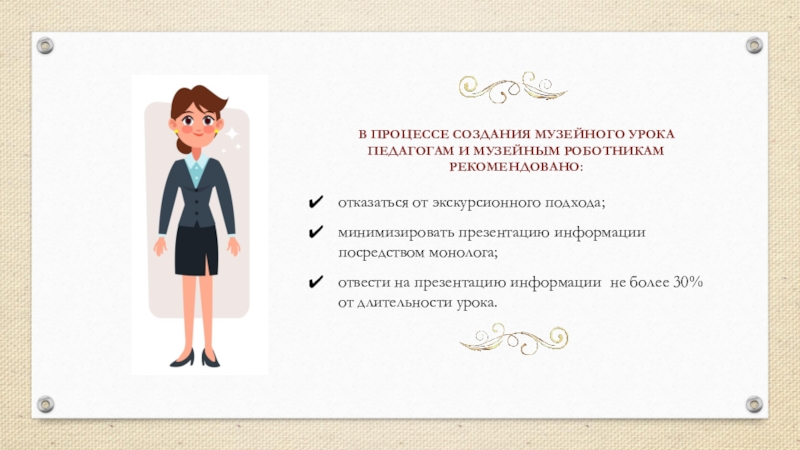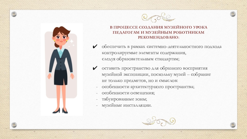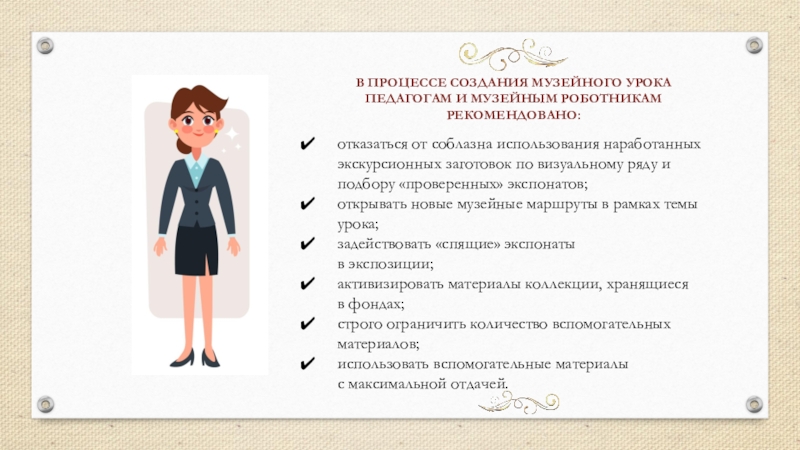 Слайд 49В ПРОЦЕССЕ ПРОЕКТИРОВАНИЯ И ПРОВЕДЕНИЯ МУЗЕЙНОГО УРОКА ПЕДАГОГАМ РЕКОМЕНДОВАНО: