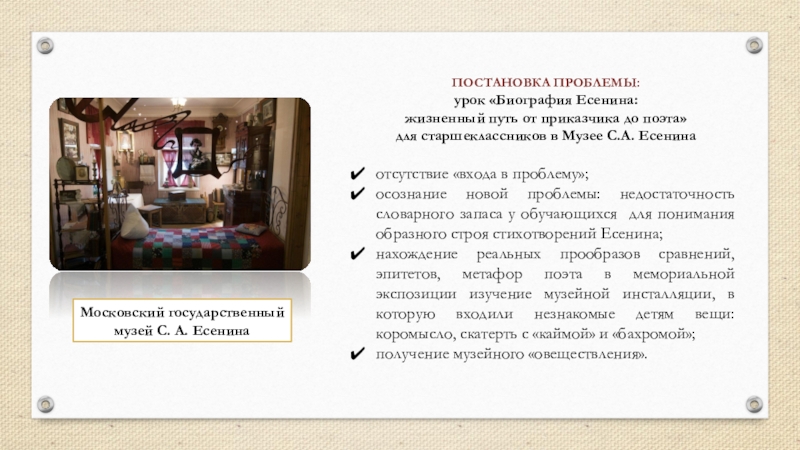 нахождение реальных прообразов сравнений, эпитетов, метафор поэта в мемориальной экспозиции изучение музейной инсталляции, в которую входили незнакомые детям вещи: коромысло, скатерть с «каймой» и «бахромой»;