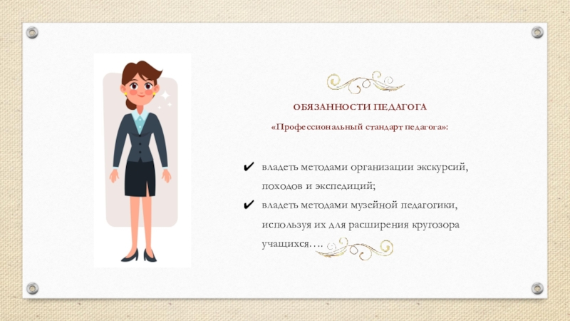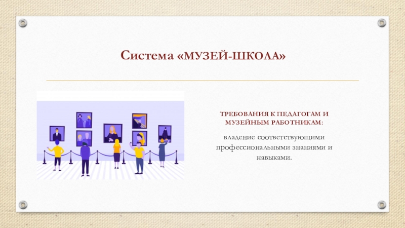 Слайд 5ТРЕБОВАНИЯ К ПЕДАГОГАМ И МУЗЕЙНЫМ РАБОТНИКАМ: