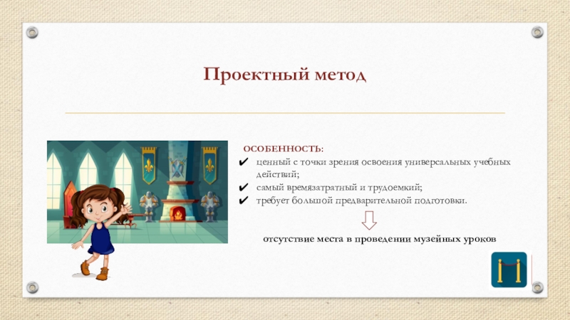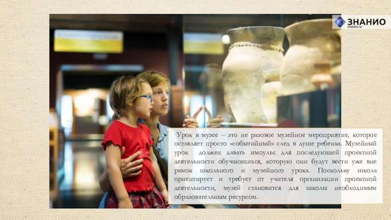 оставляет просто «событийный» след в душе ребенка. Музейный урок должен давать импульс для последующей проектной деятельности обучающихся, которую они будут вести уже вне рамок школьного и музейного урока. Поскольку школа ориентирует и требует от учителя организации проектной деятельности, музей становится для школы необходимым образовательным ресурсом.