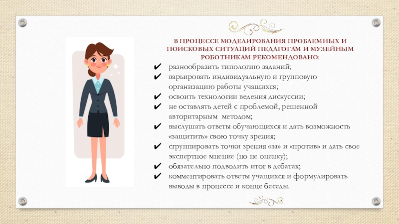 Слайд 42В ПРОЦЕССЕ МОДЕЛИРОВАНИЯ ПРОБЛЕМНЫХ И ПОИСКОВЫХ СИТУАЦИЙ ПЕДАГОГАМ И МУЗЕЙНЫМ РОБОТНИКАМ
