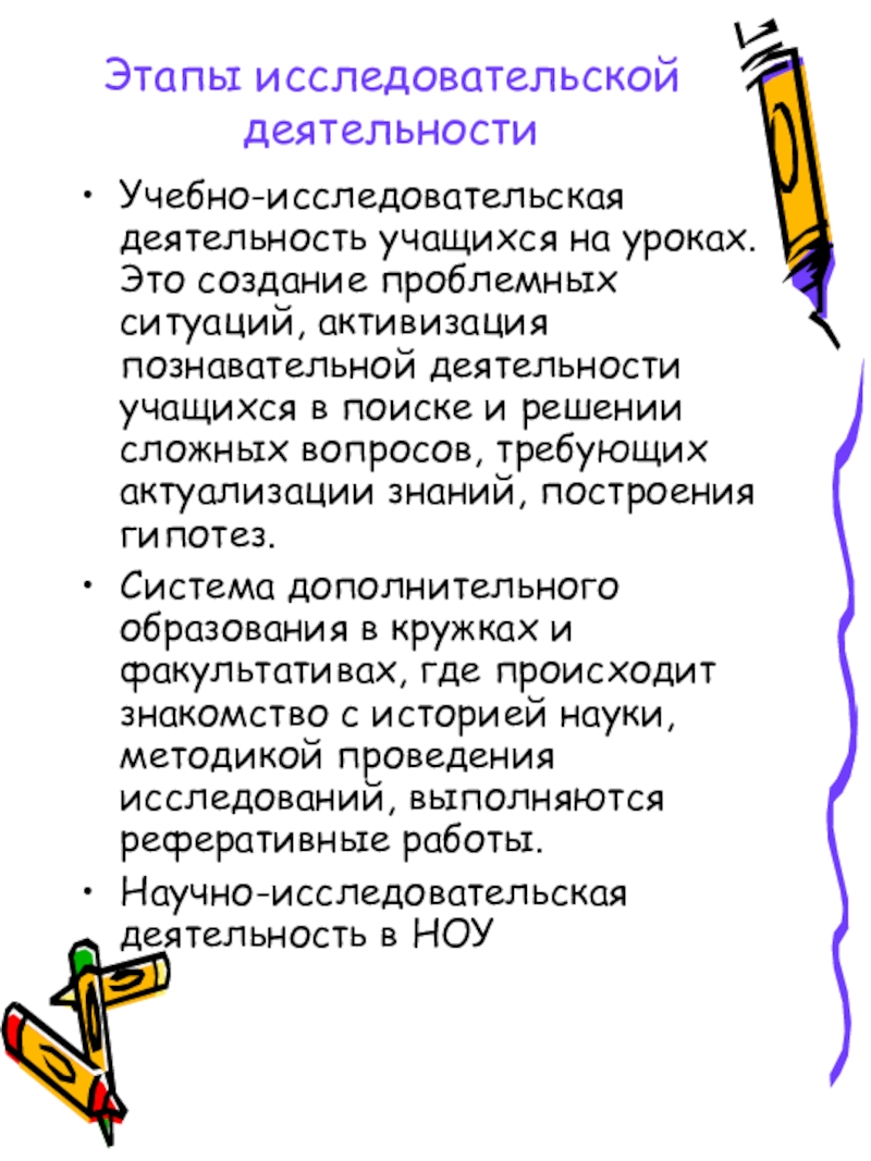 Система дополнительного образования в кружках и факультативах, где происходит знакомство с историей науки, методикой проведения исследований, выполняются реферативные работы.