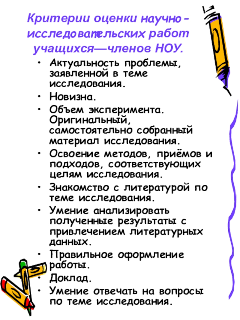 Слайд 6Критерии оценки научно-исследовательских работ учащихся—членов НОУ.