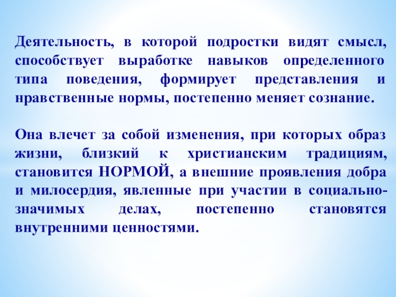 Она влечет за собой изменения, при которых образ жизни, близкий к христианским традициям, становится НОРМОЙ, а внешние проявления добра и милосердия, явленные при участии в социально-значимых делах, постепенно становятся внутренними ценностями.