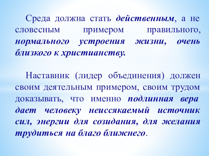 Наставник (лидер объединения) должен своим деятельным примером, своим трудом доказывать, что именно подлинная вера дает человеку неиссякаемый источник сил, энергии для созидания, для желания трудиться на благо ближнего.