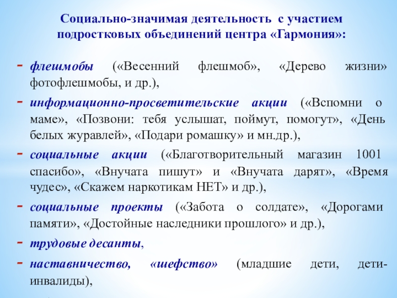 информационно-просветительские акции («Вспомни о маме», «Позвони: тебя услышат, поймут, помогут», «День белых журавлей», «Подари ромашку» и мн.др.),
