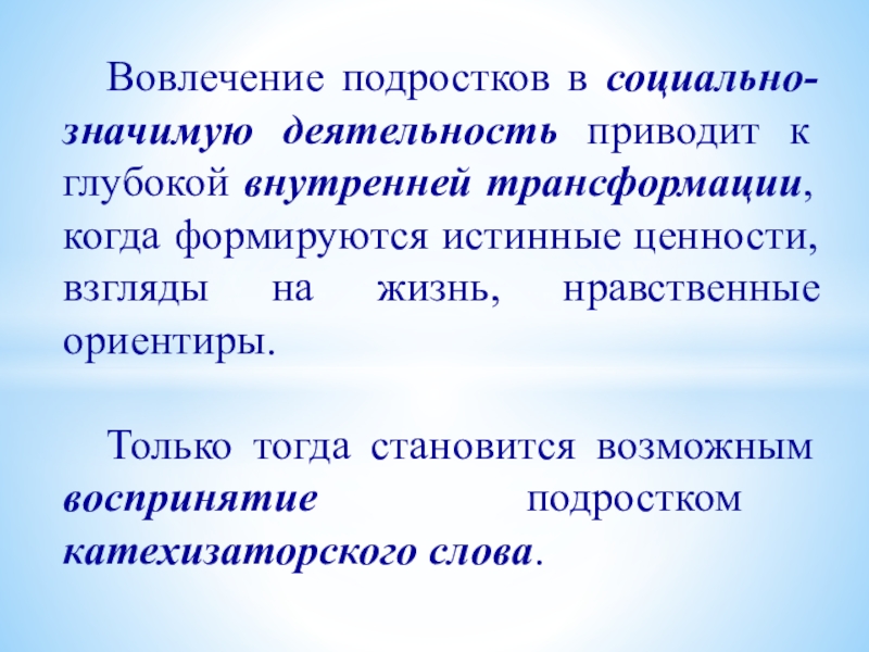 Слайд 17 Вовлечение подростков в социально-значимую деятельность приводит к глубокой внутренней трансформации, когда