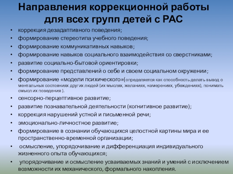 Слайд 5Направления коррекционной работы для всех групп детей с РАС