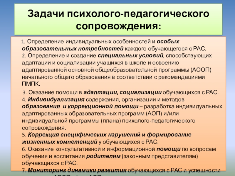4. Индивидуализация содержания, организации и методов образования и коррекционной помощи – разработка индивидуальных адаптированных образовательных программ (АОП) и/или индивидуальной программы (плана) психолого-педагогического сопровождения.