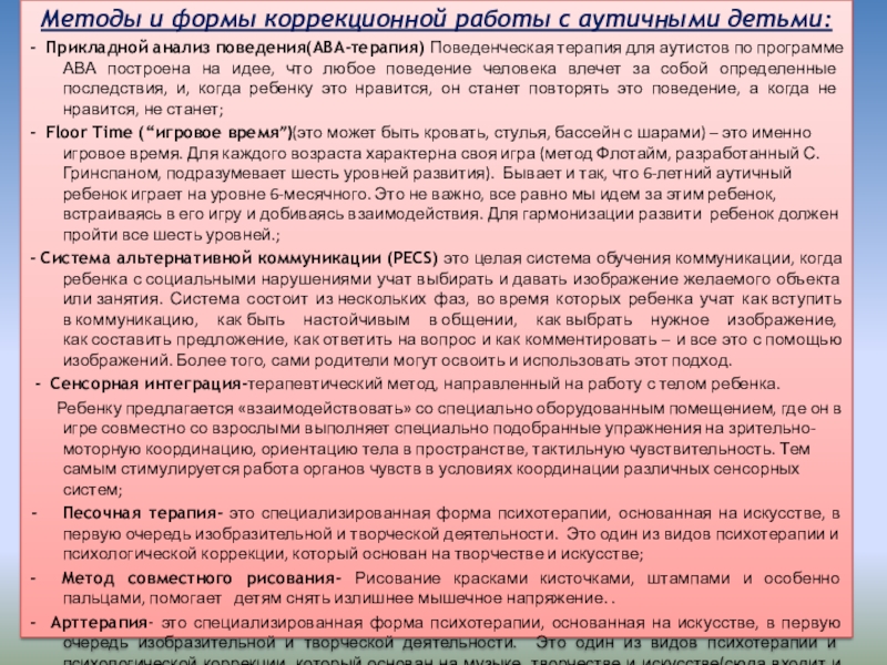 Слайд 12Методы и формы коррекционной работы с аутичными детьми: