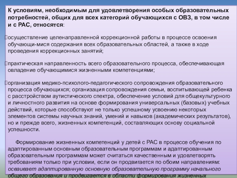 Формирование жизненных компетенций у детей с РАС в процессе обучения по адаптированным основным образовательным программам и адаптированным образовательным программам может считаться качественным и удовлетворять требованиям только при условии, если он продвигается по обоим направлениям: осваивает адаптированную основную образовательную программу начального общего образования и продвигается в области формирования жизненных компетенций.