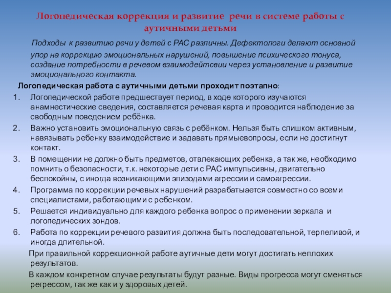 Слайд 13Логопедическая коррекция и развитие речи в системе работы с аутичными детьми